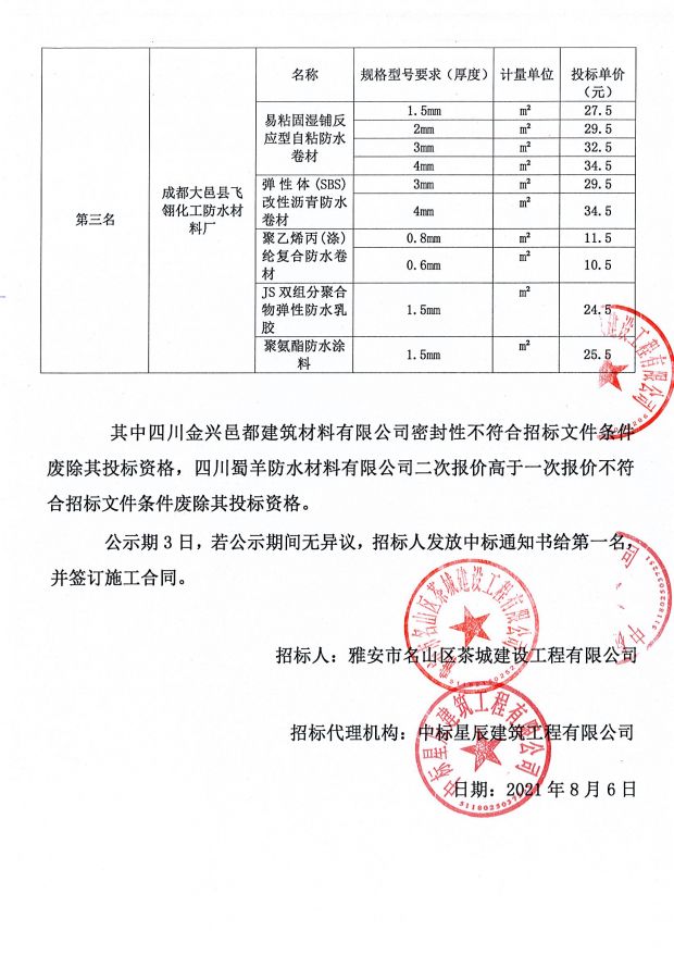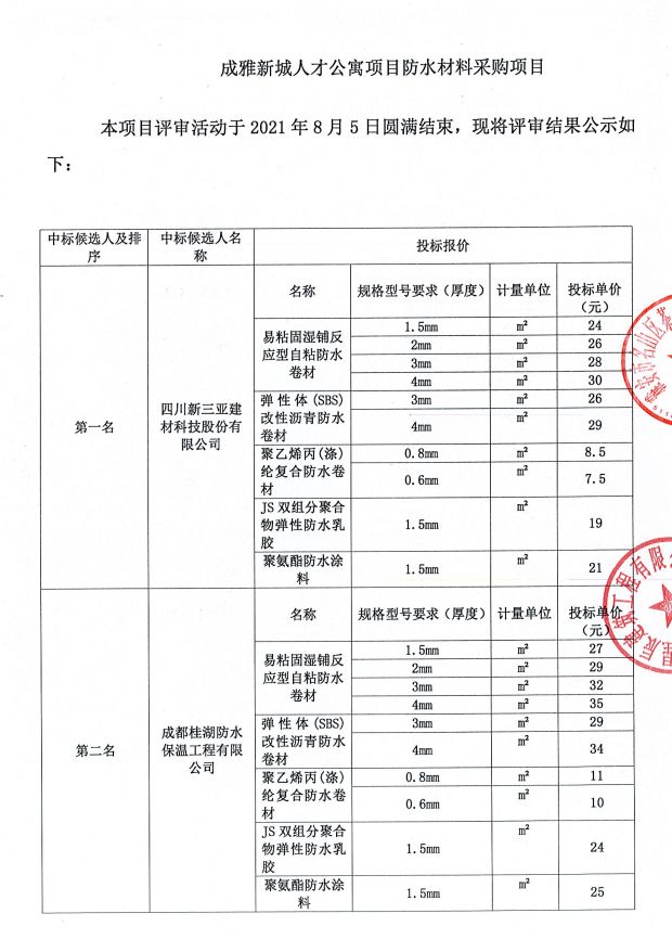 成雅新城人才公寓項(xiàng)目防水材料采購(gòu)中標(biāo)公示